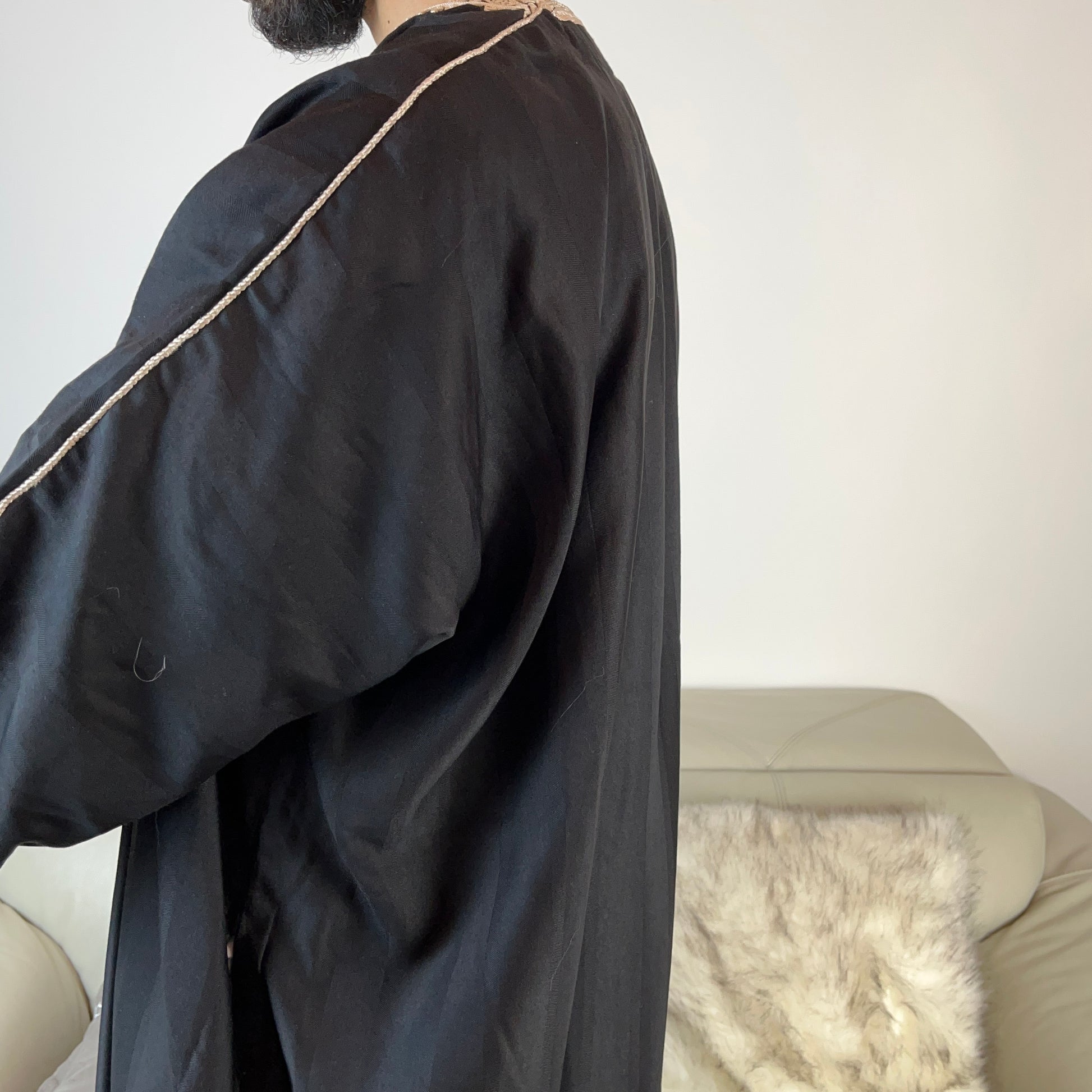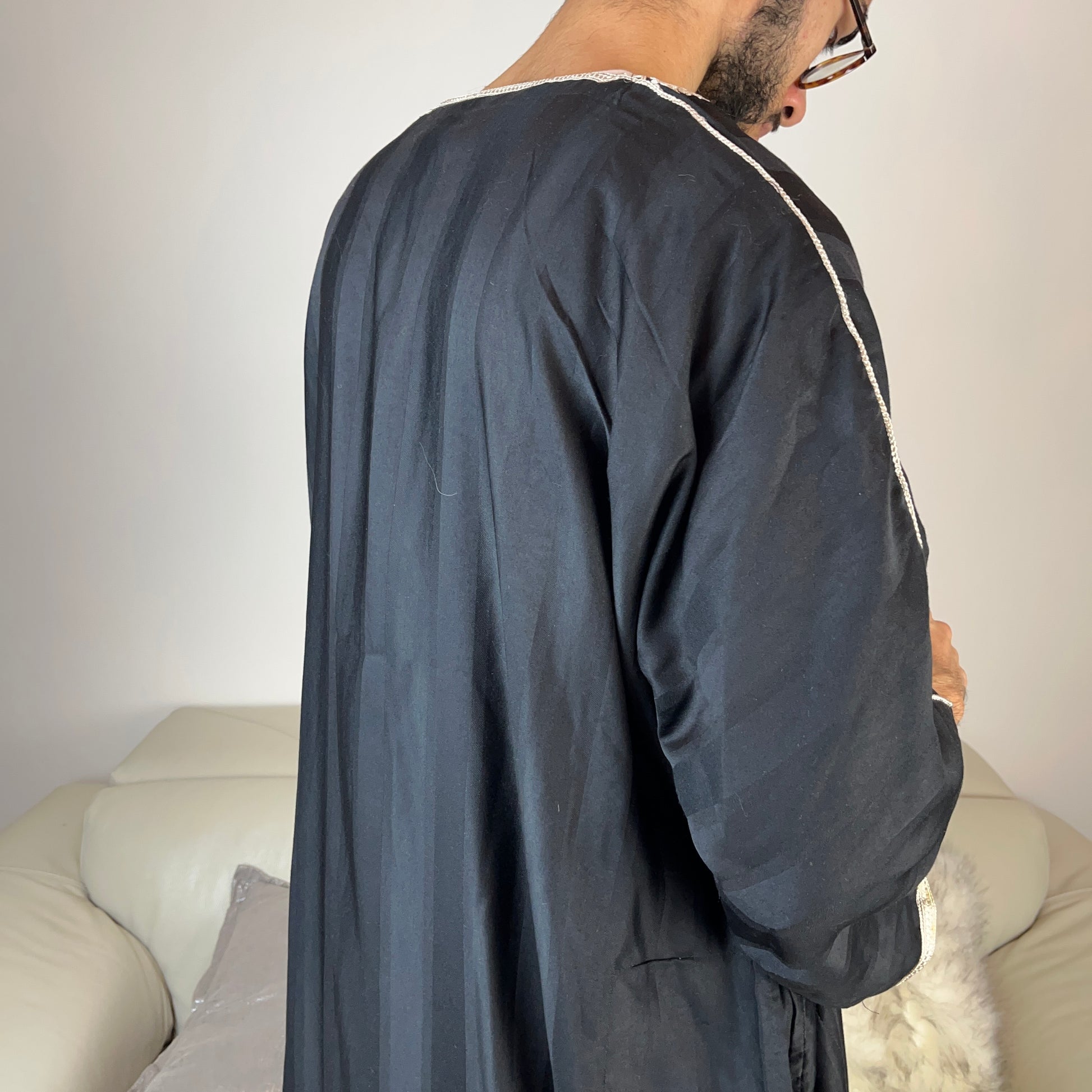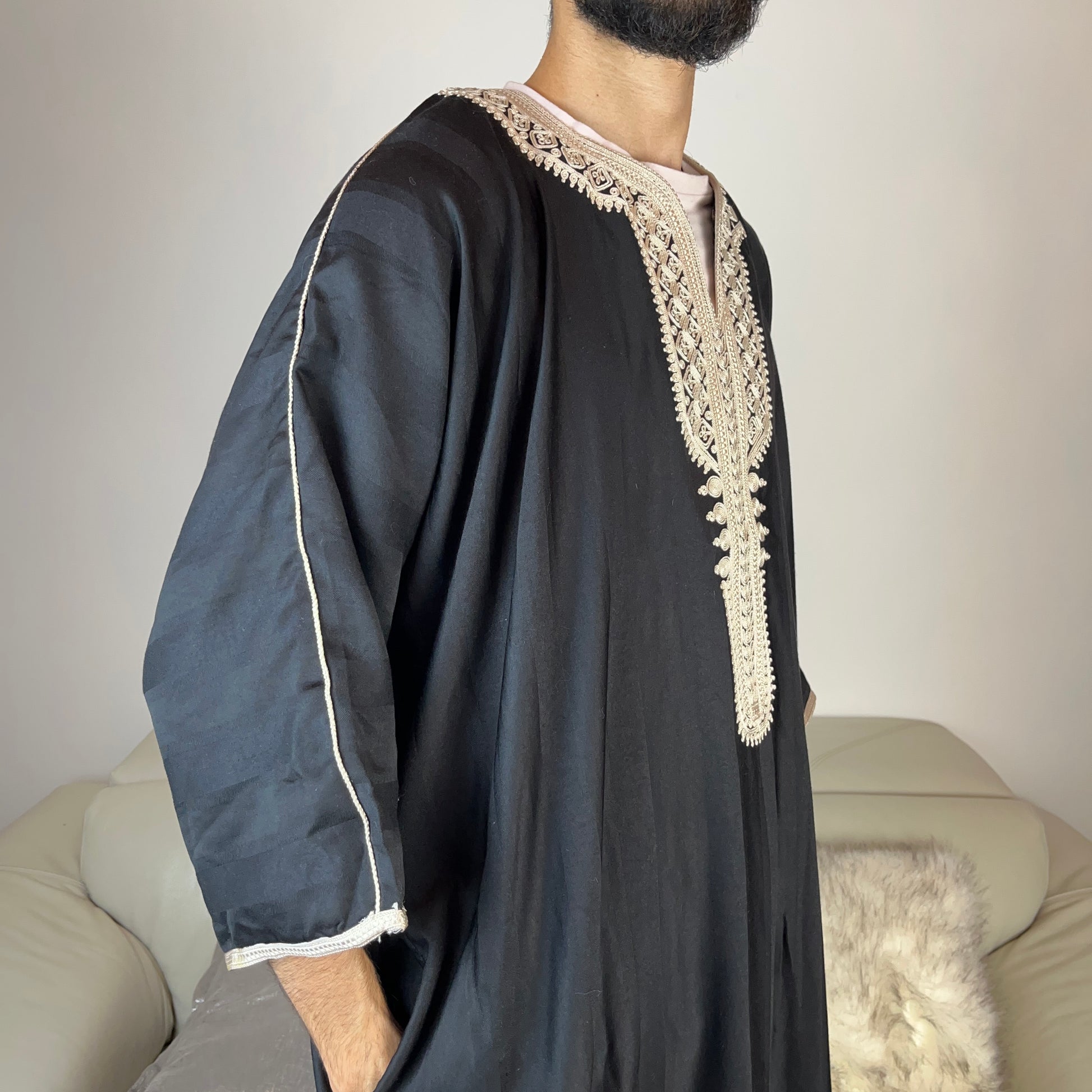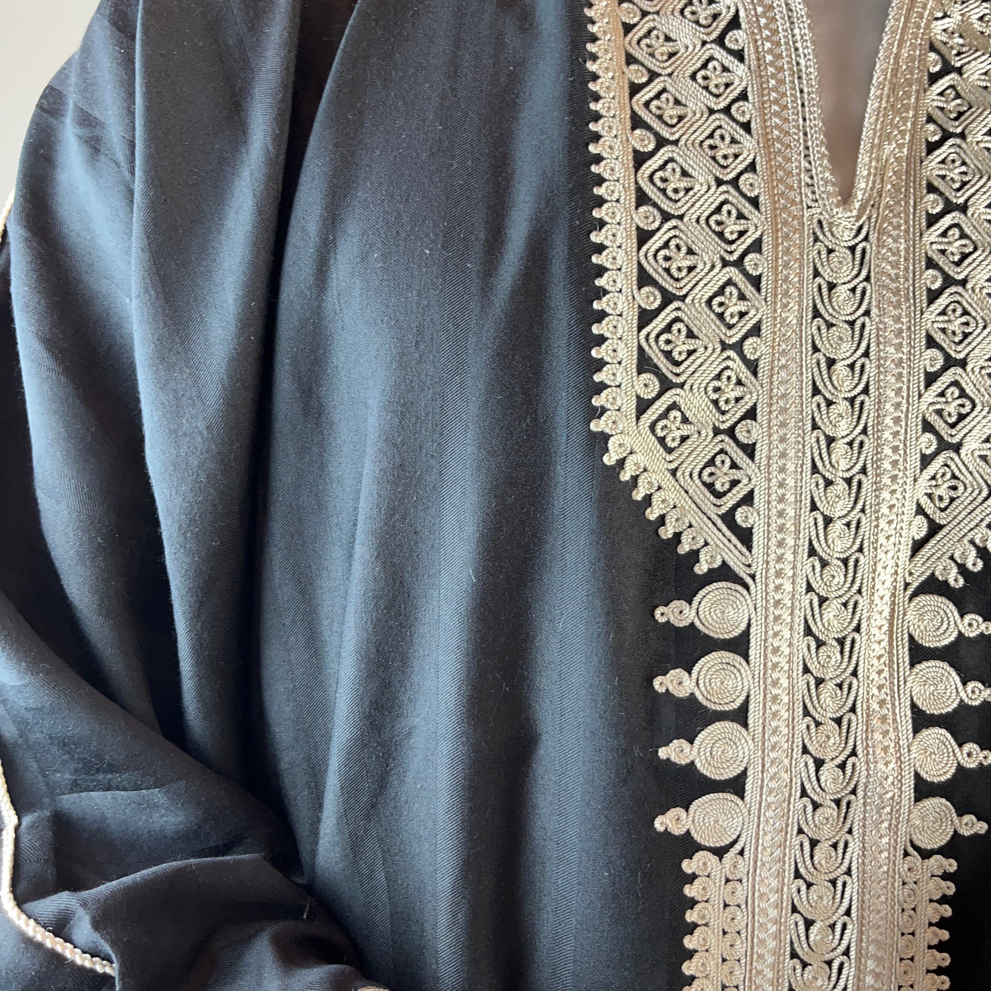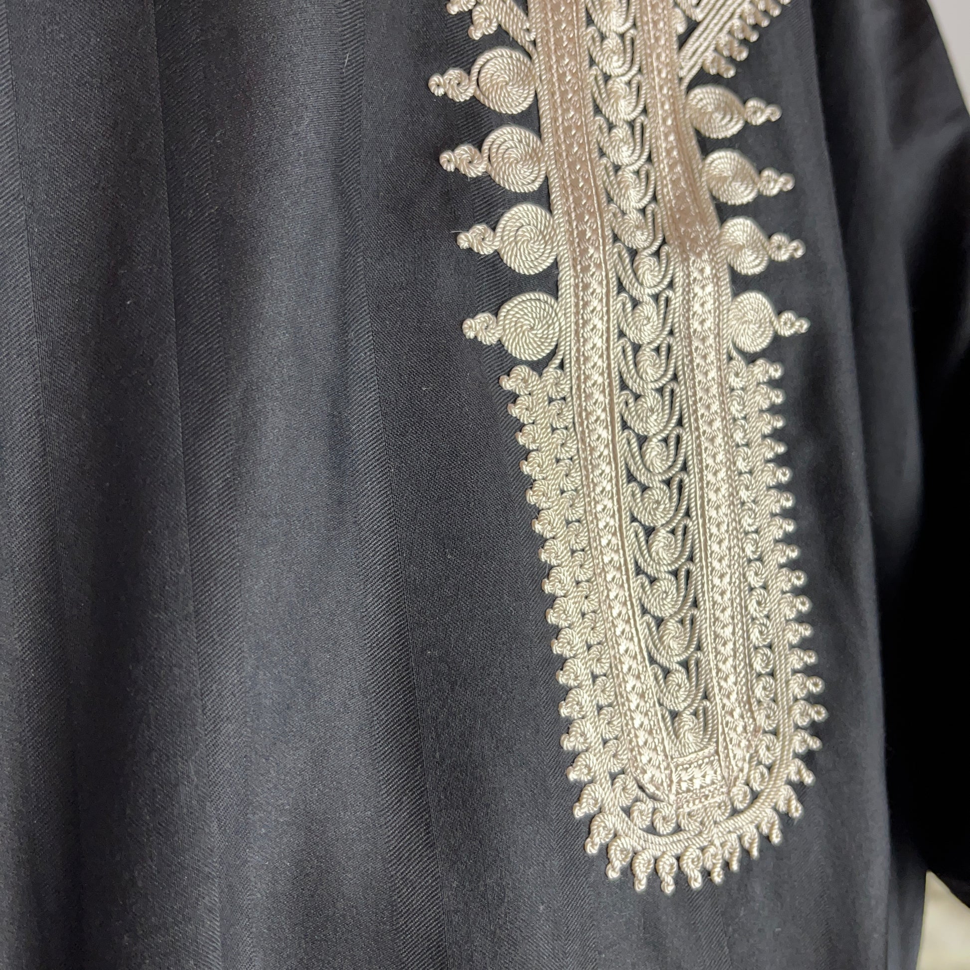 Take a trip to North Africa and pick up our beautiful Moroccan thobe in black and gold. The fit is loose and baggy, perfect to throw on top of a hoody in colder months ... or you can wear it just on its own, and it'll provide a perfect outfit on a hot summer's day.