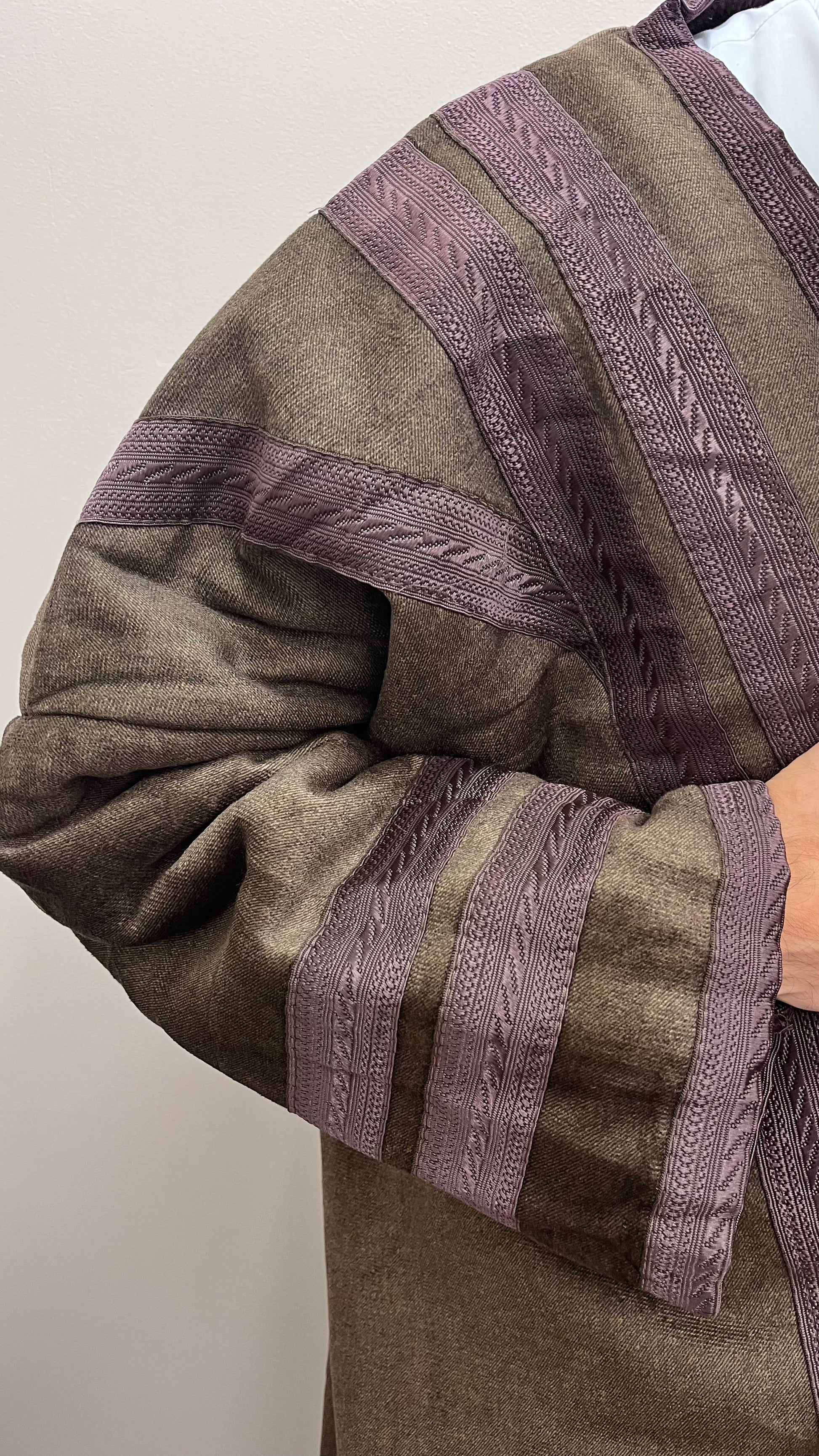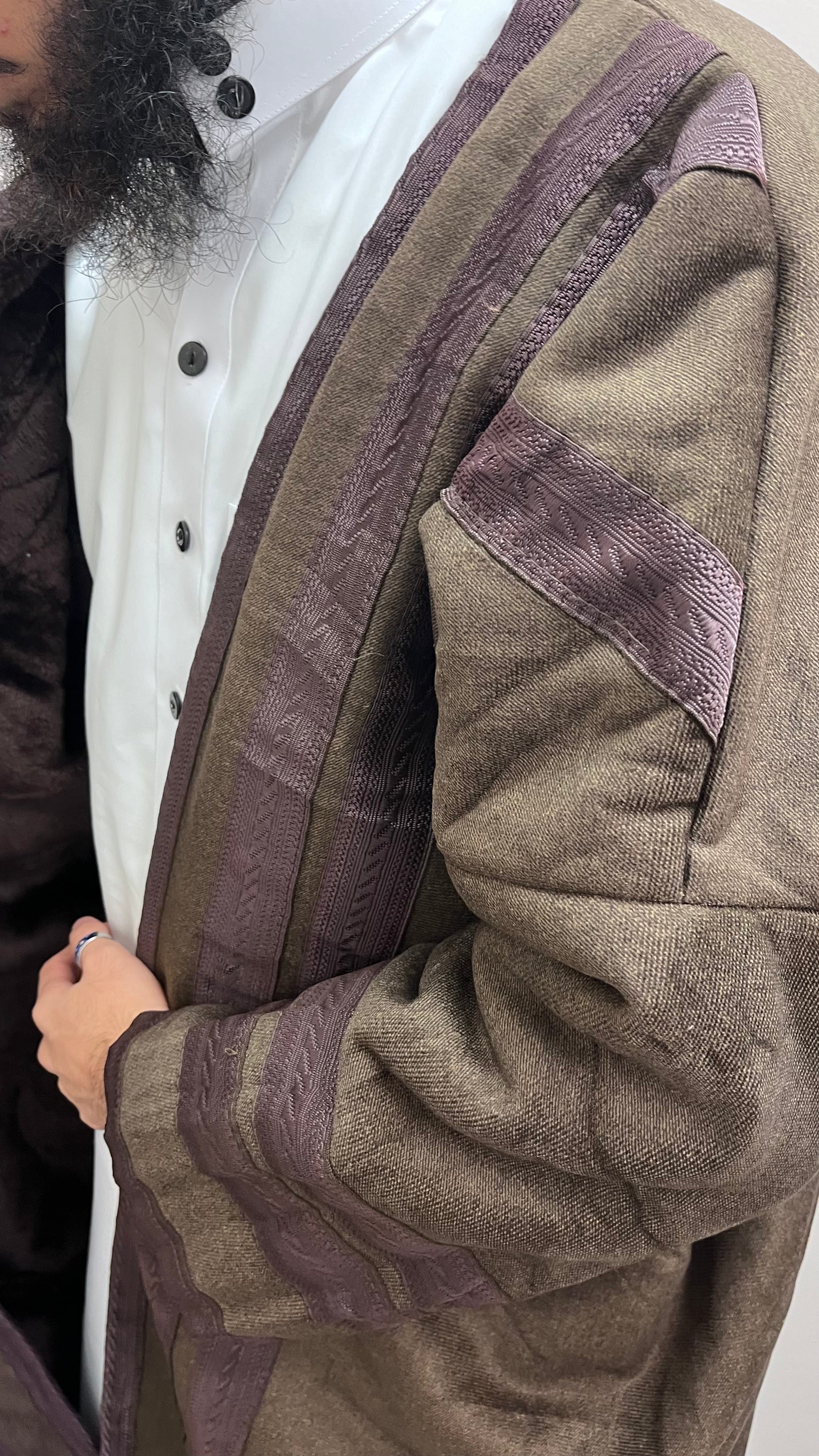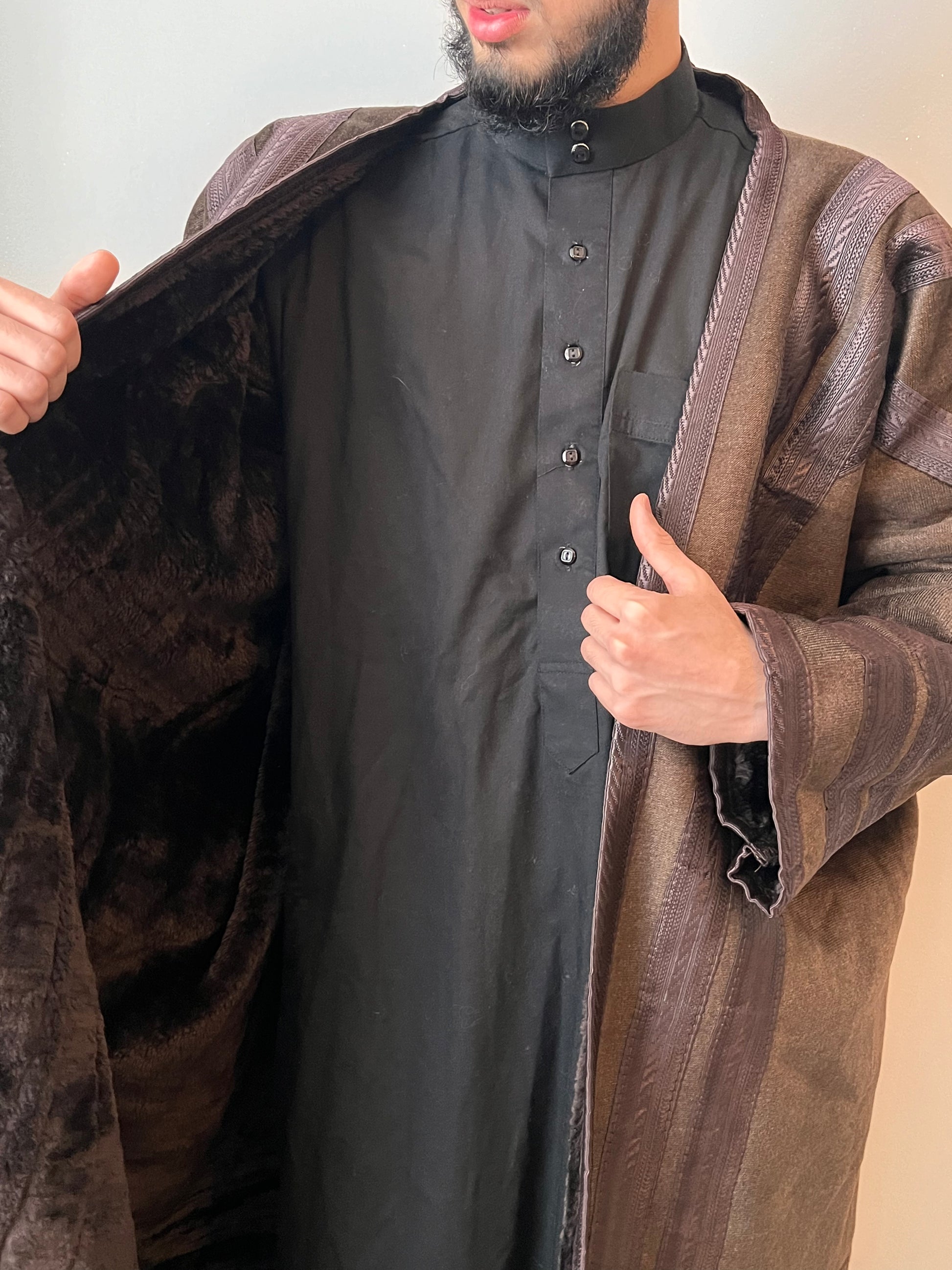 Take a trip down to Saudi Arabia with our infamous Farwa - A traditional coat that can be worn over a thobe or any clothing. Dark-Brown with purple accents is an eye-catching colour that compliments lighter tones, especially a white thobe, but can also be used as an everyday coat or with a matching dark thobe.